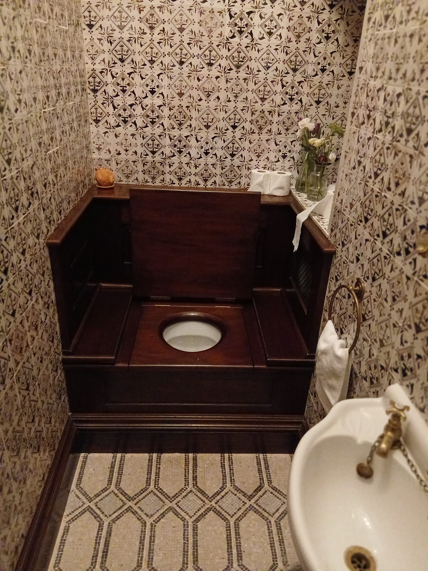 After an exquisite dinner, prepared by chef Joshua Overington with products largely sourced from the estate, I had to use the restroom. That turned out to be quite an experience, as I was able to sit on a wooden toilet with a hole in the middle, a traditional bench toilet. Very Brideshead!