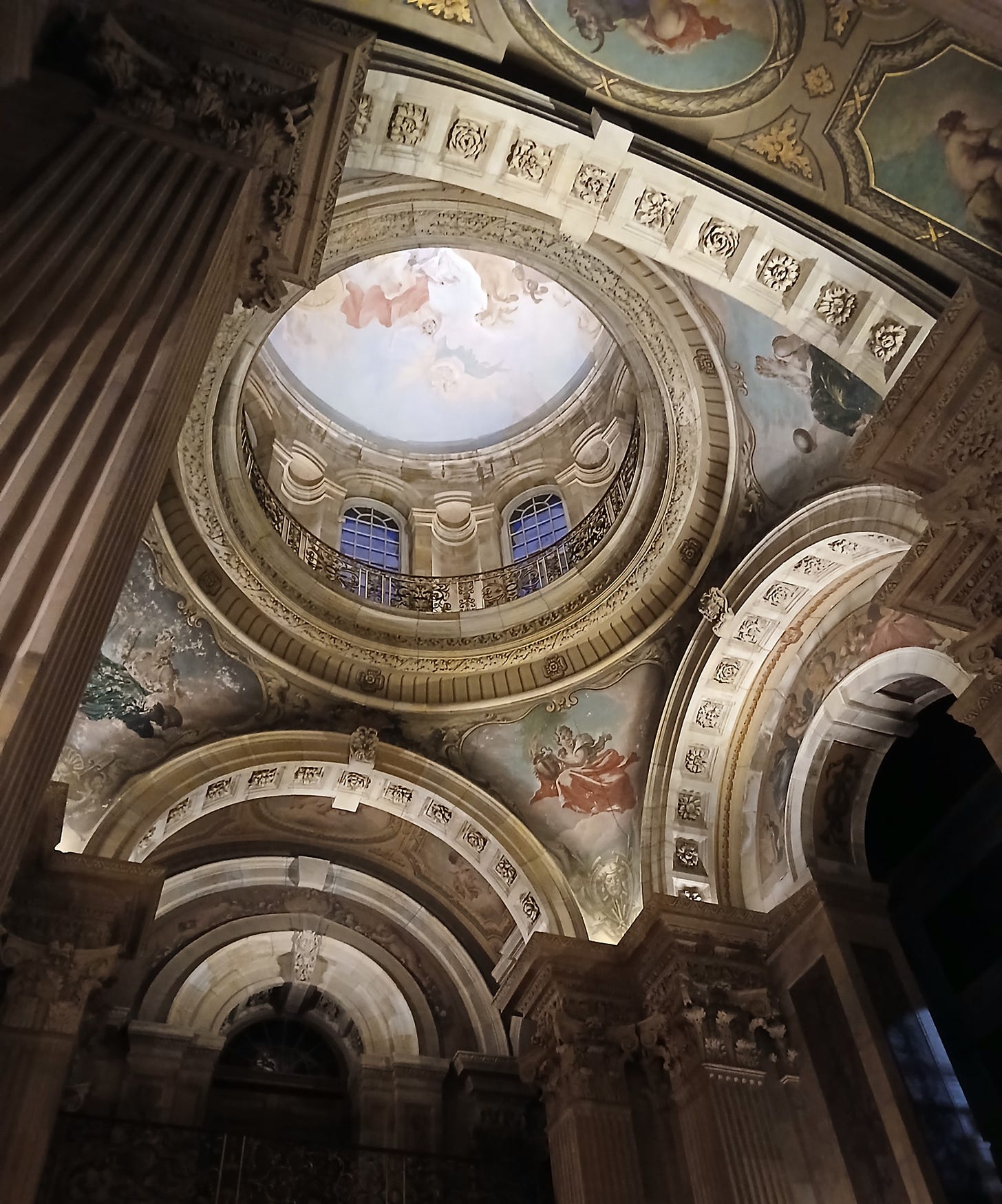 The Great Hall, with its dome, makes an imposing entrance. Inside, the dome is fully integrated into the hall’s architecture. The central space of the Great Hall is defined by the colossal substructure of the dome, which rises above the square floor plan like a gigantic canopy. On the other side of the space, framed by the southern cardinal arch, the visitor is confronted with two arched doorways, one on the ground floor, the other leading to the refectory and the staircase. These openings mark the ceremonial routes through the house.