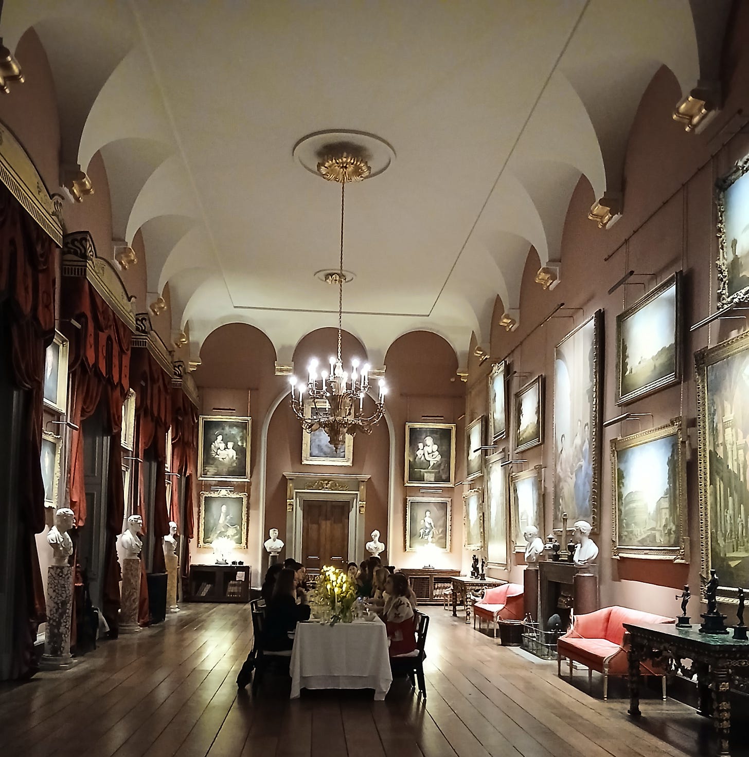 Walking through a passageway filled with statues from Roman antiquity—one of Lady Fortune had “plastic surgery on her cheek and hand” in the 17th century—I ended up in the Long Gallery, where a collection of Italian and Grand Tour paintings hangs on the wall. Among them are Pannini’s capriccios of Rome. In one, a dying gladiator is visible in the foreground of the Colosseum, resembling a statue in The Great Hall. Like many other English aristocrats living during the British Empire, the Howards were fond of Italy and antiquity.