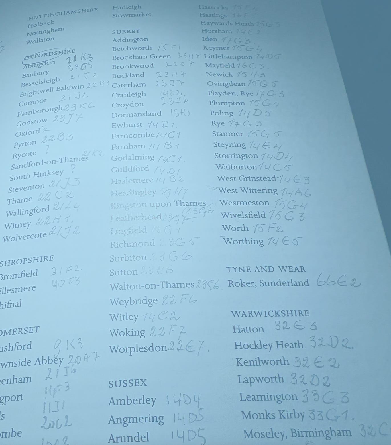 We had a book that was a catalogue of Gill’s gravestones and war memorials. I spent an evening with my uncle Fried (looking at it now, I recognise his handwriting) looking up all the place names from the book’s index and circling them on a road map. With that as our guide, we zigzagged through southern England.