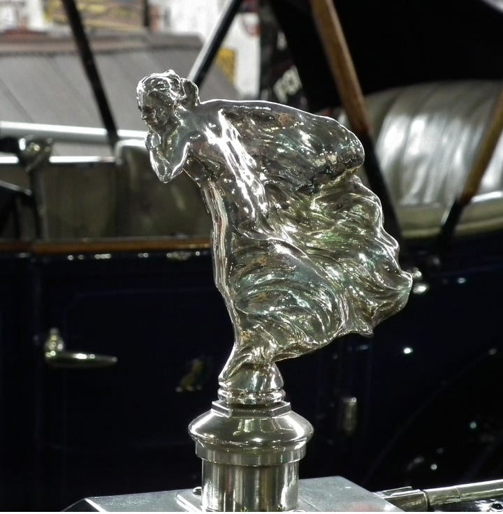 In Beaulieu, just south of Southampton, where Montagu had a country house, there’s now a unique car museum. Numerous Rolls-Royces are on display, but even better are the various statues that have adorned their hoods over the decades. Next to the Whisperer and the discontinued kneeling angel, pride of place is given to the Spirit of Ecstasy.