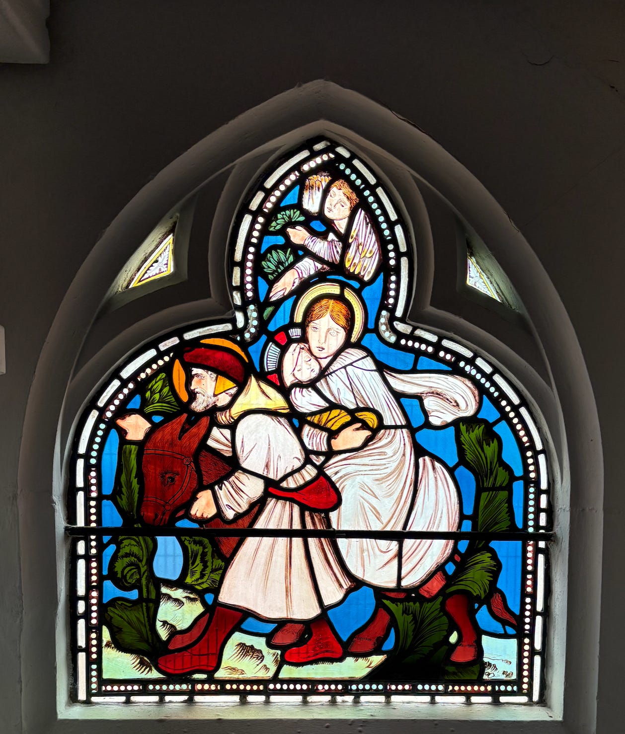 The vicar says his favourite windows are on the south side of the church. They’re by Edward Burne-Jones and depict the Flight into Egypt. Despite the miserable weather, they’re worth examining in detail. The donkey, as friendly as can be, is especially worth a look.