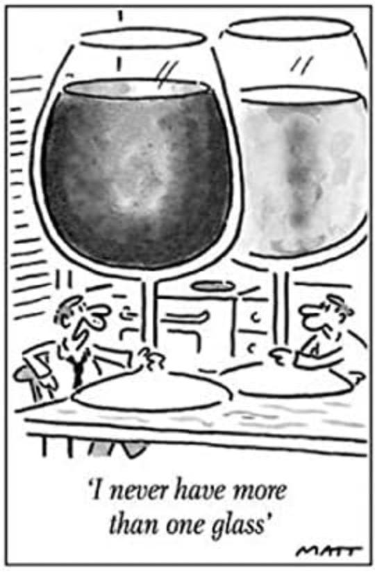 My favorite drawing by Matt is of two men in a pub with a huge glass of wine in front of them, dutifully following the medical prescription never to drink more than one glass of wine a day. I only have to think of that drawing and I cheer up, no matter what time of day.