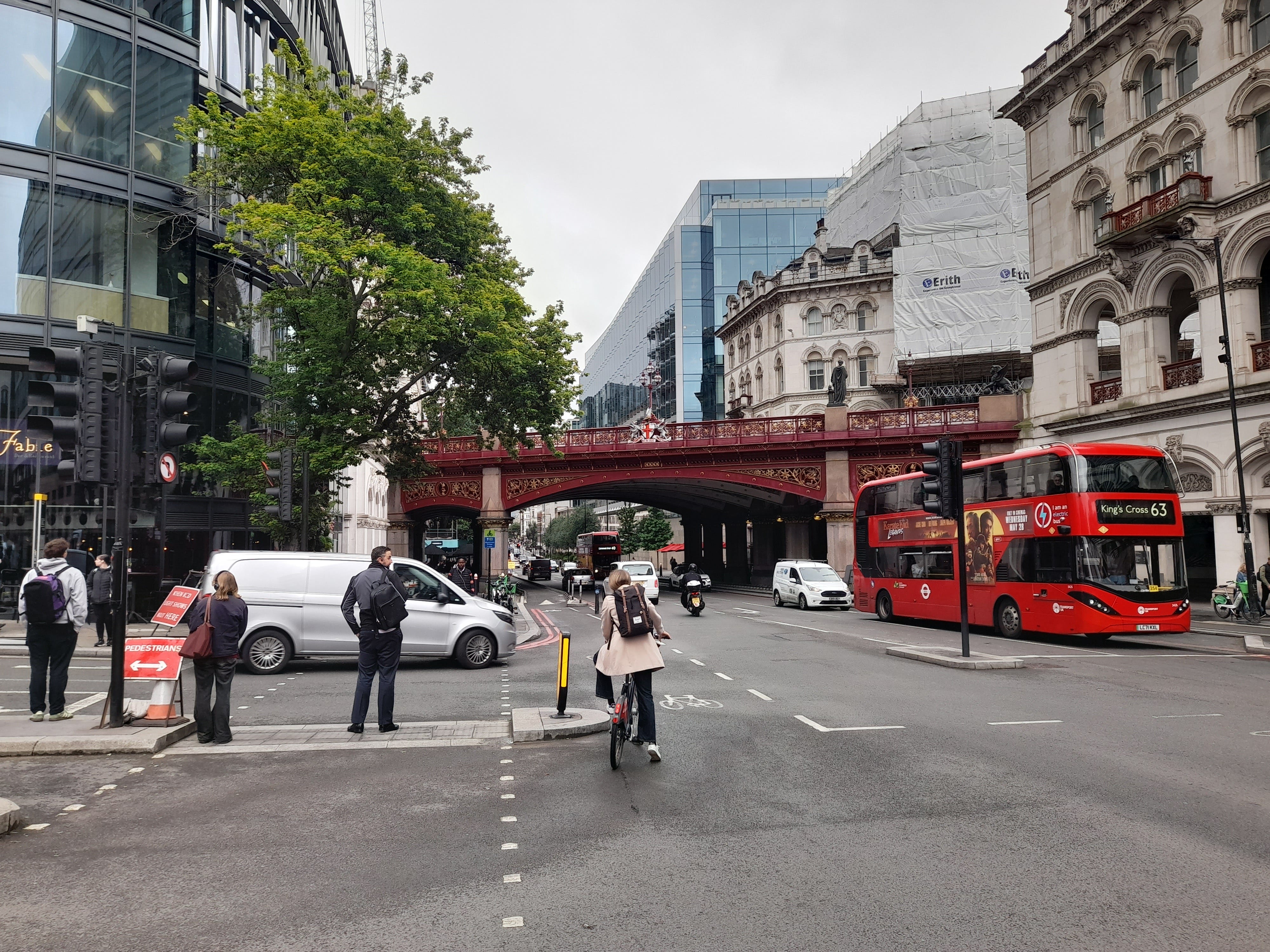 With its red, slanting span of iron girders supported by granite pillars, the new structure was described by Philip Ward-Jackson as “the most ostentatious contribution to the Victorian modernisation of the capital.” The name of the engineer, William Haywood, is inscribed on one of the pillars. He served ably for 49 years as Chief Engineer to the City Sewer Commissioners.
