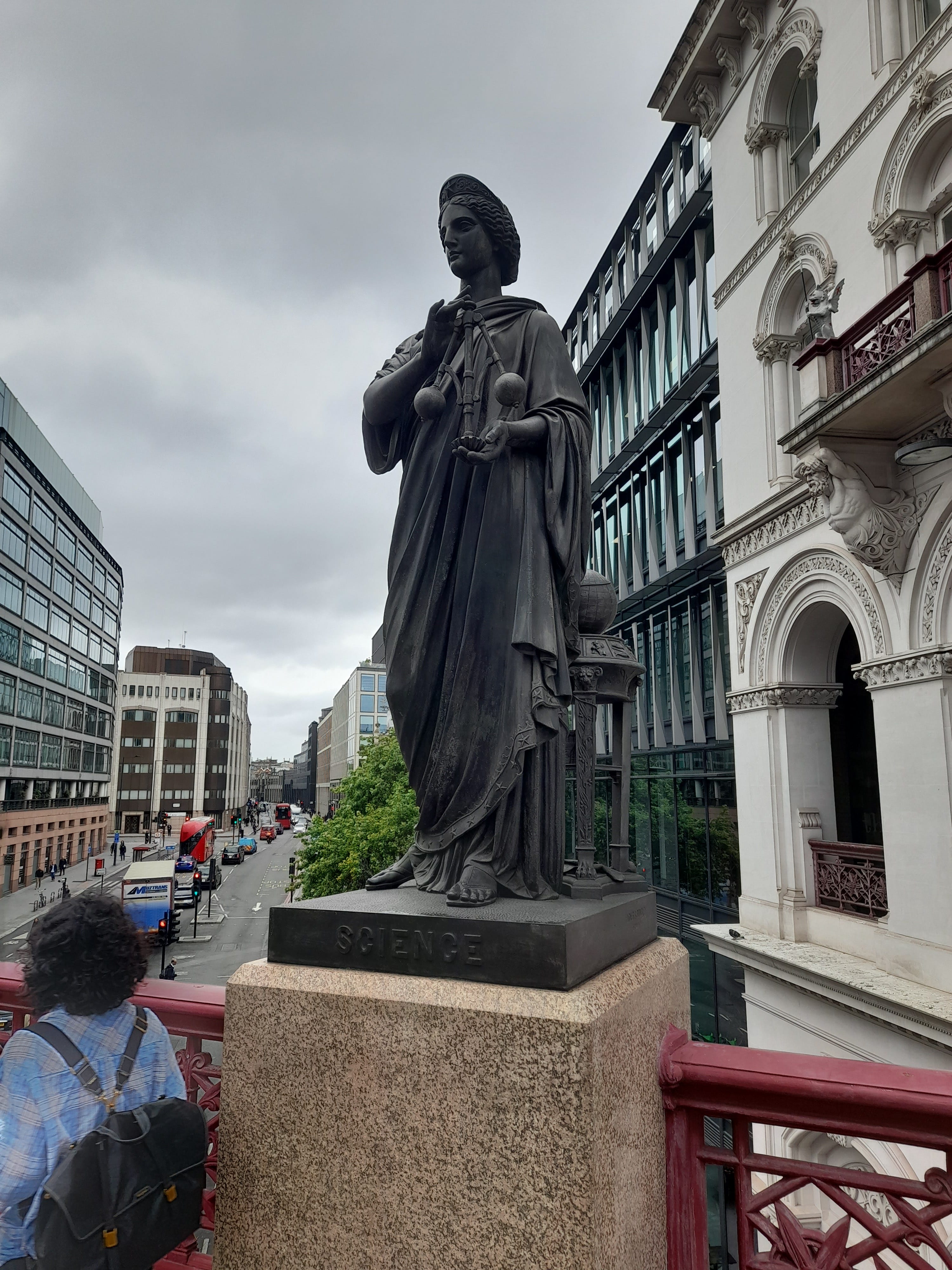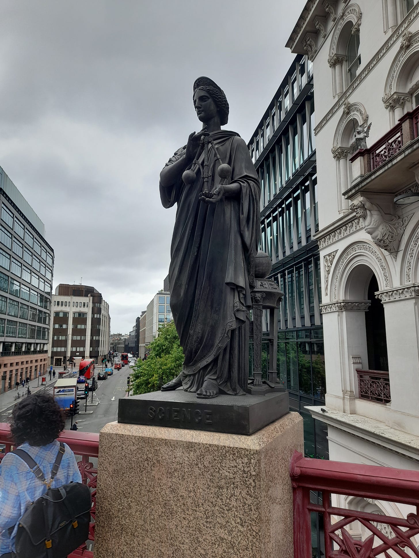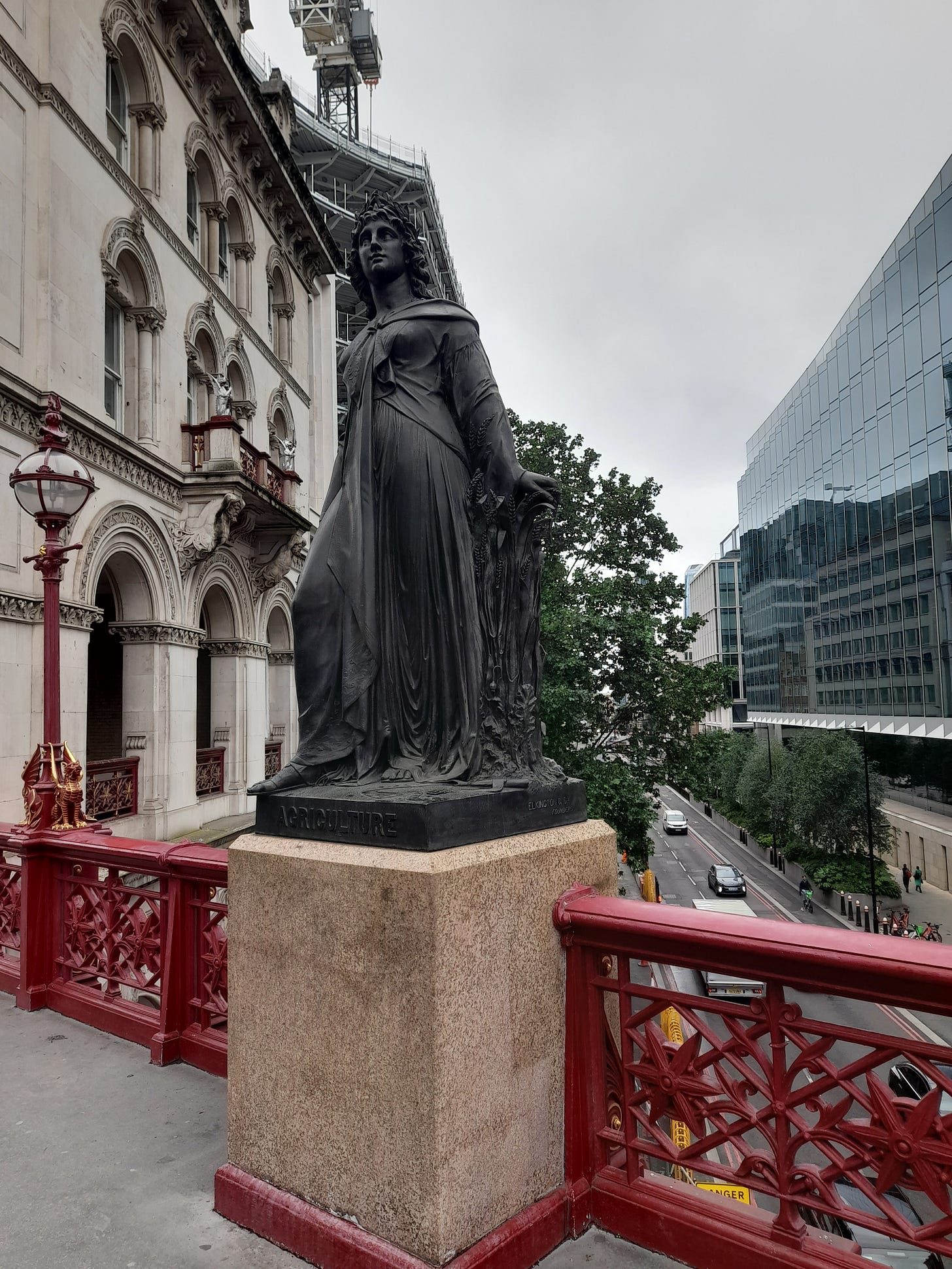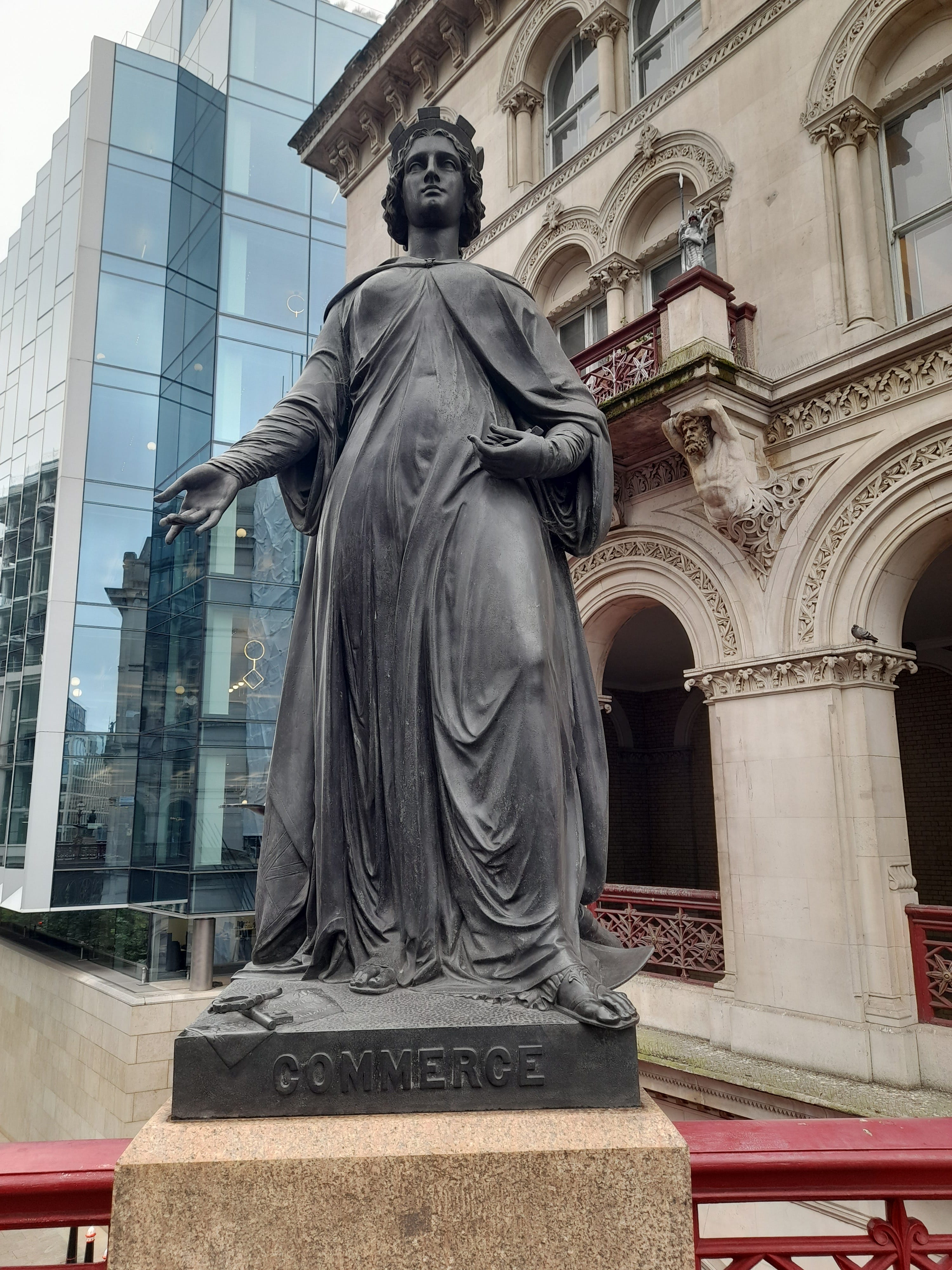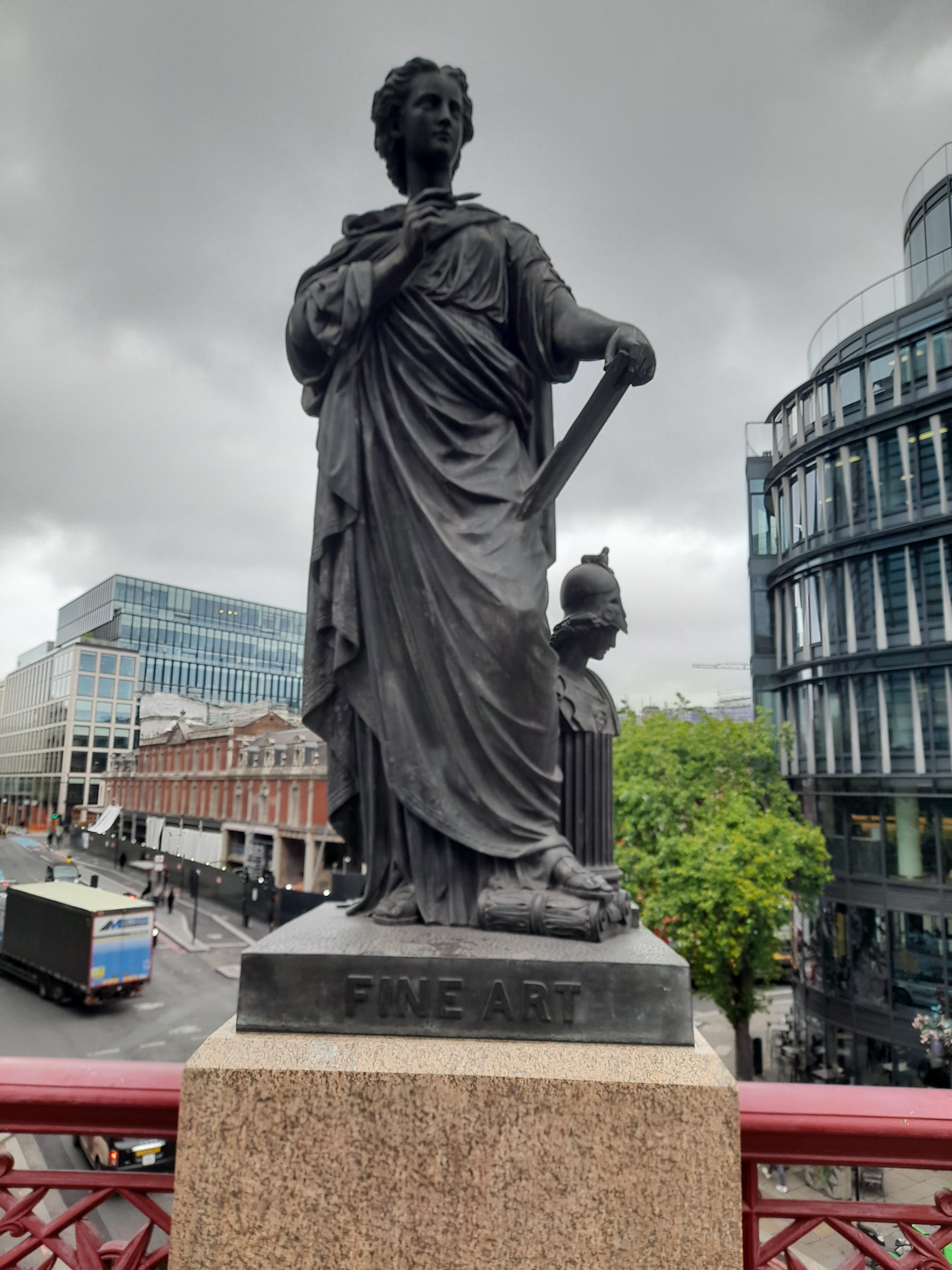 On the bridge itself, guarded by winged lions, stand four female figures representing Science, Fine Arts, Commerce, and Agriculture. Commerce wears a castellated crown, suggesting the city’s status and wealth. She holds coins and gold in one hand, while the other is extended in a gesture of welcome. At her feet lie the keys to the city and a parchment guaranteeing the city’s freedom.