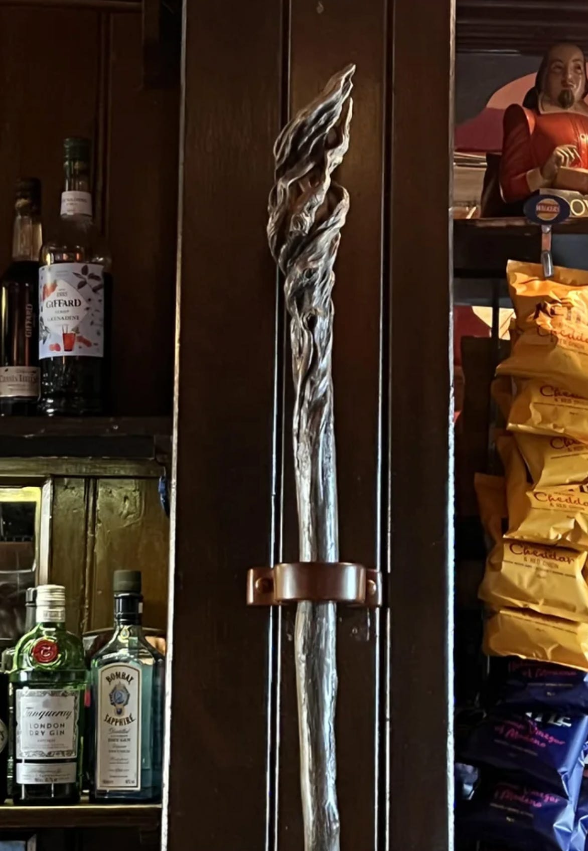 McKellen’s presence at The Grapes is palpable. Not only is there a statue of him as Gandalf in The Lord of the Rings, but his wizard’s staff also adorns the pub’s bar. Overall, it is a great pub. From the small terrace, there’s a fantastic view of Canary Wharf and of a beautiful statue by Anthony Gormley in the Thames. That also has a connection with McKellen. More on that next time.