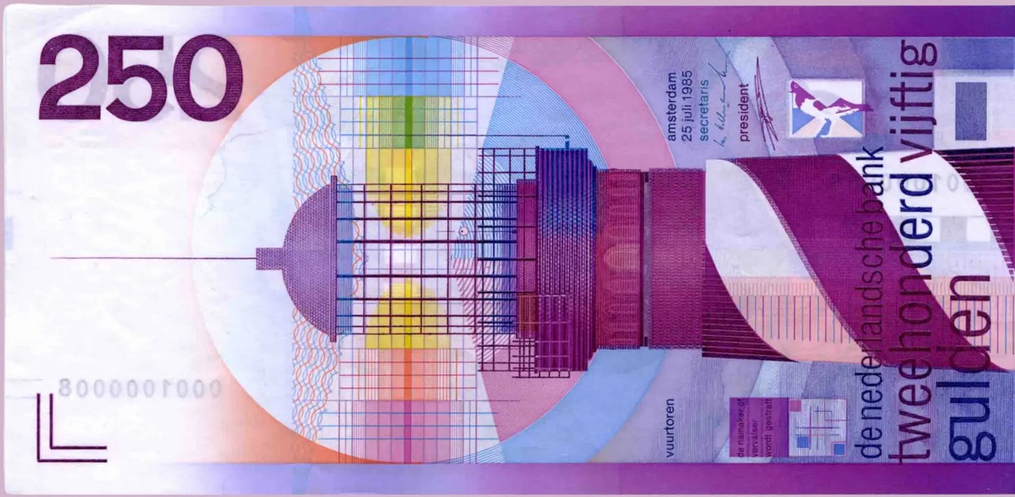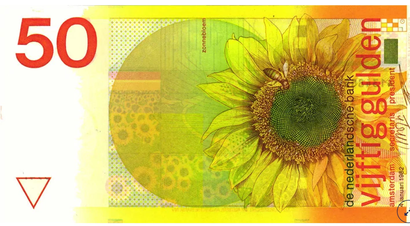 Poor Jacob. He’s wrong again. As a Dutchman, I feel qualified to pass judgment on banknotes. Before the euro was introduced, the Netherlands had the most beautiful banknotes in the world. I especially loved the yellow sunflower. I still have a copy of it in a stamp album somewhere, but I can’t find it right now.